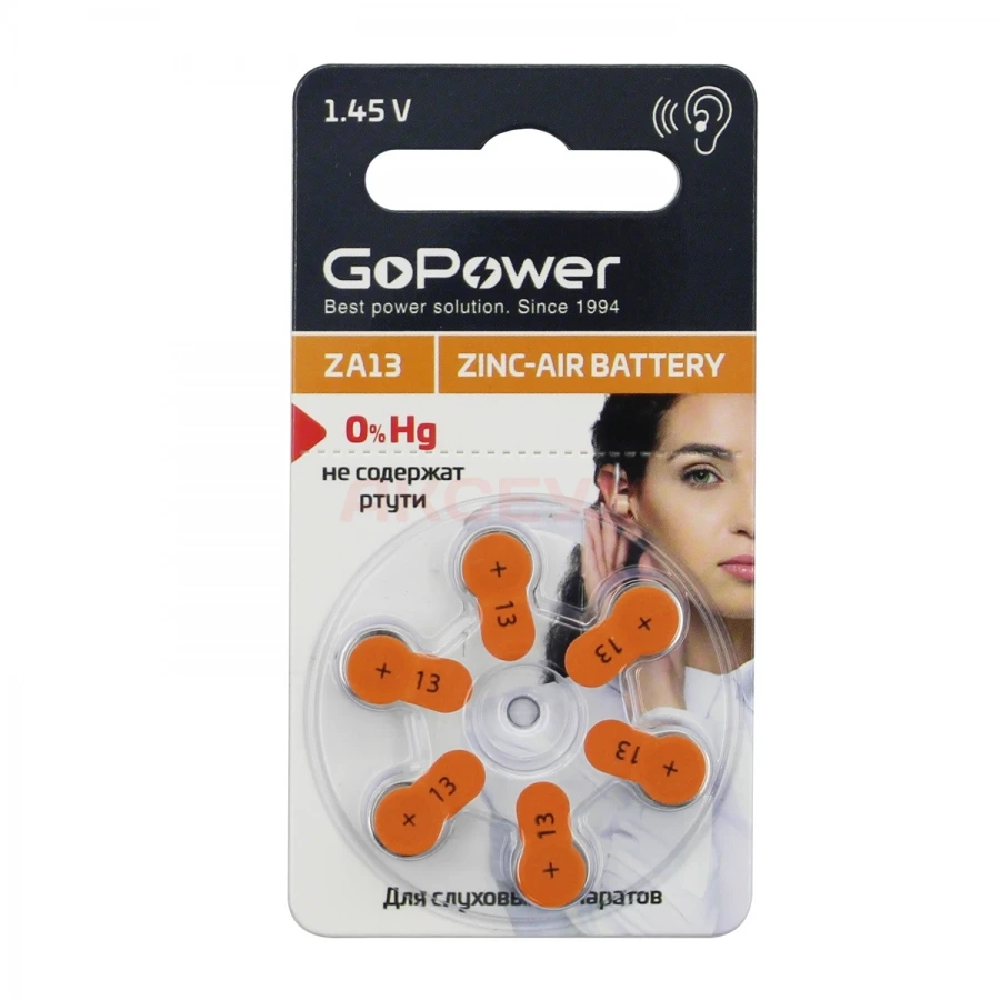 Батарейка ZA13 GoPower Zinc Air 1.45V для слуховых аппаратов (6 шт в блистере)